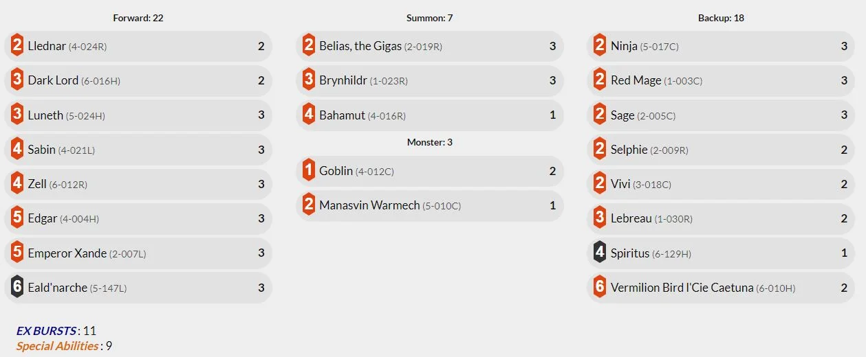 This deck played better than I expected. A lot of conversation has been had about whether or not Fire is a strong element, and it seems most people are not really in favor of running a Mono Fire deck. While I am not a big fan of the Dark Lord + Eald'narche strategies, it was a joy to play Fire cards. Fire might have the strongest and most aggressive Forwards of any element.
