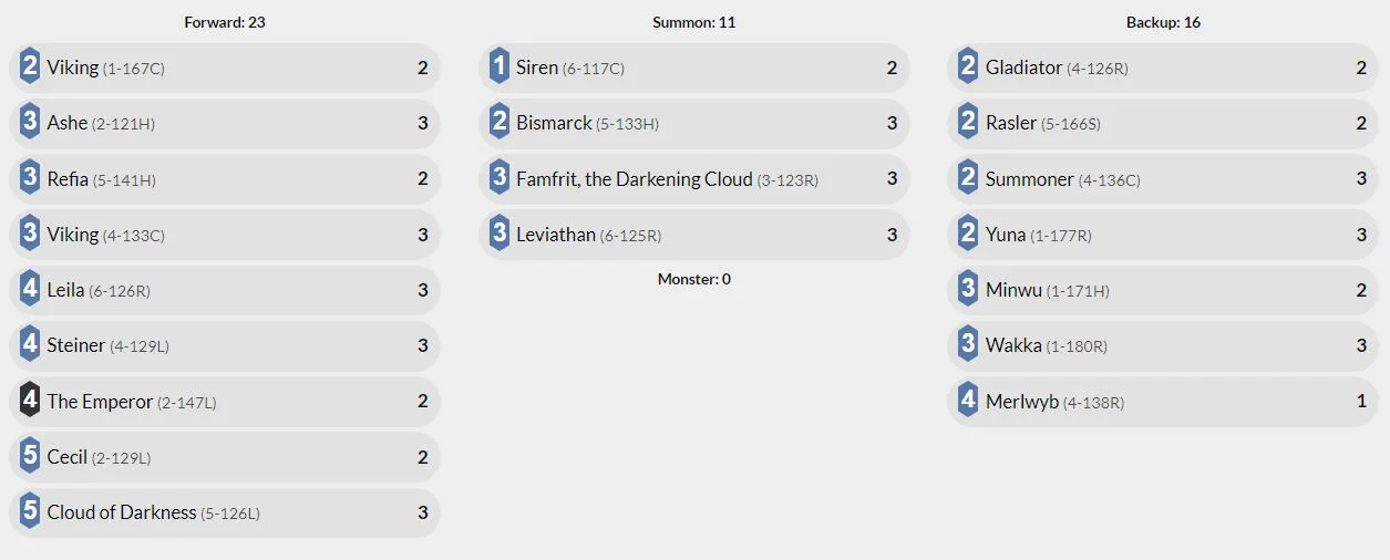 3x Yuna: In accordance with being more efficient than your opponent, this Backup allows you to get more value out of your Summons by reducing their cost by 1. You always want to have this Backup out as it makes the deck pop the most. Leviathan and Famfrit only costing 2CP and 1CP for Bismarck allows you to quickly outvalue your opponent while they try to deal with your large board of Forwards.