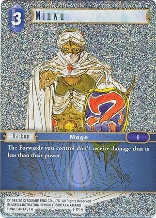 Minwu (1-171H) is the very last effect that is checked when calculating how much damage will be dealt to a creature. All modifiers on damage are accounted for first, and once a final damage has been determined, Minwu checks to see if that damage is less than a Forward’s power. If the damage is less than the Forward’s power, that Forward takes no damage instead.