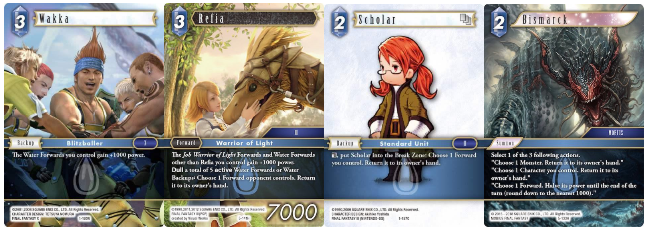 Accept Combat Trades with Other Forwards - While the first few entries have been concentrated on actually killing Cagnazzo, it’s important to remember that his purpose is to give the Mono-Water player enough time to develop a board and kill you. If you see a Mono-Water player making attacks and providing you the opportunity to trade your Forwards for theirs, it can be acceptable to take the trade, even if you haven’t taken much damage. The reason for this is that Mono-Water needs a huge board to be at its most effective, and if you can cull some of their units in the mid-game (particularly Refia), their late game is delayed. Taking chances to keep their board under control also gives you more time to win before Cagnazzo can be bounced and replayed. A major caveat to this comes in the form of Bismarck (5-133H), who can win combat from the hand for only two mana.