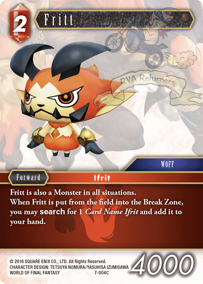 Fritt is another in the cycle of Forwards that are also Monsters. At 2 CP, he is costed comfortably as a 4000 Power Forward / Monster. When he hits the Break Zone, you may search your deck for one card named Ifrit and put it into your hand.
