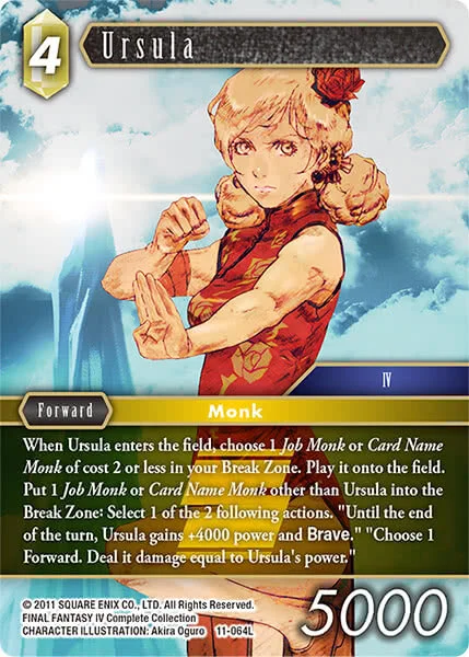 There are three main advantages to Ursula. Number one: she can bring a backup Monk into play from the Break Zone which is just fantastic in early turns. Number two: she herself can be brought from hand for free if you’re playing Opus III Yang. And, finally: her ability to put other monks into the Break Zone and deal damage or boost her own power. With these thoughts in mind, I wanted to build a list that exploited these mechanics for a very aggressive set of forwards with efficient removal.