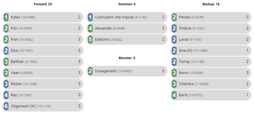 At the end of the day, the worst part of the list were the summons and interaction package. Perhaps heralded by Kadaj, this game feels like summons and responses matter more today than last set. I moved some things around in here to accommodate for Unsaganashi at three copies, and Chelinka in the backup line. Unsaganashi never feels bad to play, but three may be too many. It could be a play style preference, but I don’t feel like the things I took out were correct. I’ll get into them in the next section.