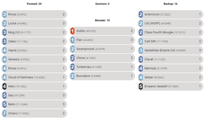 Relm is just great in this list. She’s always going to find you monsters that you want in Flan or Goblin. Setzer helps you replay her if you draw one and then don’t see others from draw. Once you play her twice, you feel like you’ve really bought yourself some turns.