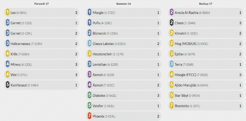 Let’s finish this off with a bit of a thought experiment…a dream of mine, if you will. Given how bad the math is for six-element decks with even element splits, can we build a reliable six-element deck? I think the answer is yes, though we will need to pull a Kingdom Hearts and embrace the darkness to make it work. If we start with a base of three Chaos and one Kam’lanut to search for him, we’ll have a solid foundation of backups that produce any element we need. We can then add a package of Earth backups and forwards that help us generate whatever elements we need: three Moogle (FFCC), three Leo, one Shantotto, two Kimahri, and two Epitav. Between all of those searchers and multi-color producing characters, we have an 85 percent chance of seeing one of those cards in our initial hand and a 99 percent chance to see one if we mulligan. That means we will have access to at least one of any element from turn two at the latest. So what do we get for all of that effort? How about we dip into the summon synergies that are spread over every element?